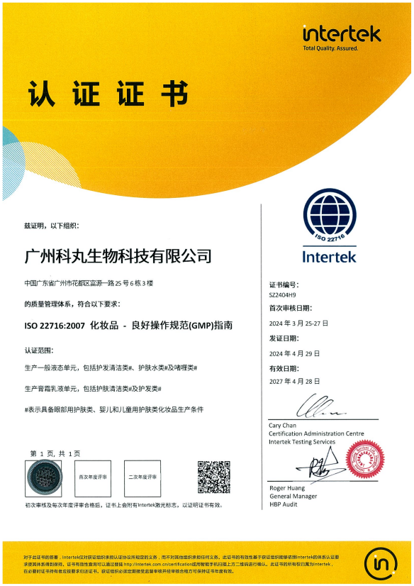 In April 2024, Guangzhou Cowin Biotechnology Co., Ltd. officially passed the ISO22716/GMPC Good Manufacturing Practice Quality Management System certification for cosmetics, marking that Cowin Biotechnology's production quality management level has reached international standards and can continuously and stably provide customers with safe, healthy, and high-quality products.